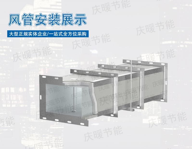 庆暖节能一体式漂珠硅晶耐火风管是一款满足新烟规耐火极限要求的新型防排烟通风管道。其采用的漂珠硅晶耐火板是一种轻质耐高温硬质板材,改善了硅酸盐防火板质量重、隔热性差的缺点,也解决了岩棉、硅酸铝棉等柔性耐火材料强度低、纤维易脱落等弊端,相比于其它防火、耐火材料更适合应用于通风管道的耐火隔热。风管连接型材采用专用钢制一体式法兰,具有较高的连接强度和组装便捷度,内外面层均采用高耐腐蚀金属板,使用寿命可达30年以上。一体式漂珠硅晶耐火风管相比传统镀锌钢板风管外包耐火层工艺,不仅具有更好的耐火隔热性能,而且还具有体积质量轻、结构强度高、施工简便、提升标高,美观度好、售后风险小、使用寿命长等优点。从而解决了防排烟耐火风管设计、施工及运行过程中的诸多问题,是传统镀锌钢板风管外包岩棉+防火板的理想替代产品。